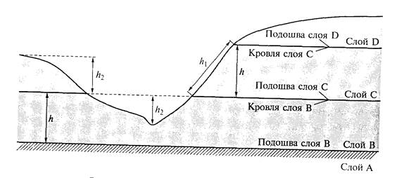 Рис. 9. Слои горных пород и их элементы: h – истинная мощность, h1 -видимая мощность, h2 – неполная мощность