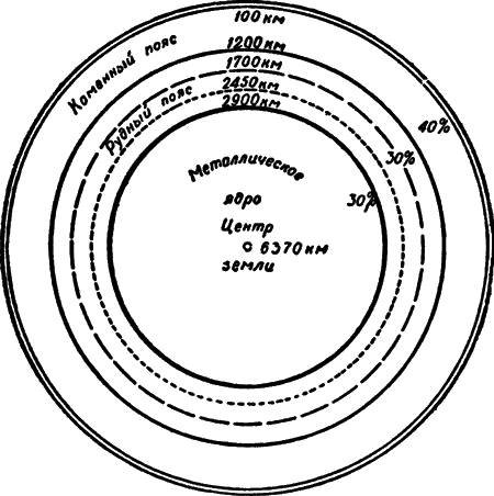 Из каких минералов состоит вся наша Земля? Прежде всего хочется думать, что из тех же минералов и горных пород, которые нас окружают и которые мы используем в нашей жизни. Наука, однако, дает нам совершенно другой ответ, и оказывается, что вся Земля в своих глубинах совсем не похожа на то, что мы видим непосредственно вокруг себя. Из нашего очерка вы увидите, что Земля по своему составу больше напоминает наше Солнце, чем знакомые нам и окружающие нас известняки, песчаники, глины и граниты. Мы знаем, что на поверхности Земли, — там, где работает человек, — одних веществ больше, других меньше. Одни мы называем редкими и с трудом извлекаем их из земных недр для целей промышленности, других — сколько угодно под руками человека. Правда, такое различие зависит от того, что одни вещества очень сильно рассеяны в природе и не дают или редко дают большие скопления, другие, наоборот, часто образуют большие массы — месторождения. Помимо этого, вещества действительно находятся в земной коре не в одинаковых количествах: на долю одних приходится почти половина земной коры, на долю других — только миллиардные доли. В 1889 году американский химик Кларк задумал вычислить средний состав земной оболочки. Оказывается, что из девяносто двух различных веществ, или, как их называют химики, химических элементов, только очень немногие вокруг нас находятся в большом количестве. Замечательно, что больше половины окружающей нас природы состоит из двух газов: кислорода и водорода. Только на третье место по объему мы можем поставить элемент кремний, который с кислородом образует минерал кварц. Но и кремния всего только 15 процентов, а такие важные, хорошо знакомые нам металлы, как кальций (в известняке), натрий (в морской воде и поваренной соли), железо, входят всего лишь в количестве от одного до двух процентов. Замечательная картина вокруг нас; природа на девяносто девять процентов построена только из двенадцати веществ, и, соединяя различным образом эти вещества между собой, мы и получаем всё разнообразие и наших минералов и продуктов жизни! Но так ли обстоит дело и с другими частями нашей Земли? Чтобы ответить на этот вопрос, мы должны с вами мысленно проделать длинный и сложный путь от поверхности Земли к ее центру — путь длинный, больше шести тысяч километров, путь очень своеобразный и фантастический. Я вспоминаю, как в 1936 году в Чехословакии я спускался в глубочайшую в Европе шахту в глубины Земли. Мы летели вниз на площадке открытого электрического лифта со скоростью восьми-десяти метров в секунду; свистел ветер, скрипели продольные рельсы, воздух становился влажным и теплым. Через несколько минут мы были на дне шахты: в ушах звенело, сердце усиленно билось, температура вокруг была около 38° — влажная температура тропиков. Ведь мы были всего лишь на глубине тысячи трехсот метров, то есть проделали только одну пятитысячную часть нашего мысленного путешествия к центру Земли. В самой глубокой шахте, которую пробил человек, он смог спуститься только на два с половиной километра (золотой рудник в Африке). Вся деятельность человека, его работа и странствования, его жизнь связаны с маленькой, тоненькой пленкой коры нашей планеты.