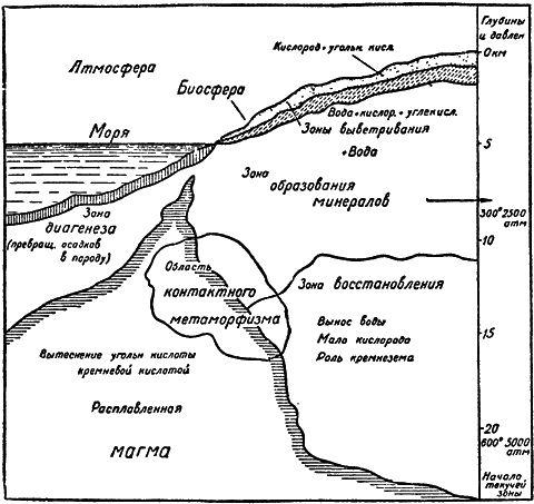 Состав твердой горной породы — это далеко не то, что состав самого расплавленного очага. Огромное количество летучих соединений пропитывает его расплавленную смесь, выделяется могучими струями, пронизывает ее покров; и долго курится и дымится ее очаг, пока смесь совсем не застынет и не превратится в твердую горную породу. Только ничтожная часть этих газов остается внутри затвердевшей массы, другая часть поднимается к земной поверхности в виде газовых струй. Далеко не все эти летучие соединения успевают достигнуть земной поверхности. Огромная часть их осаждается еще в глубинах, пары воды сгущаются; по трещинам и жилам текут к поверхности Земли горячие источники, медленно охлаждаясь и постепенно выделяя из растворов минерал за минералом. Часть газов насыщает воды и в виде ключей или гейзеров вырывается на поверхность Земли, другая скоро находит себе другие пути и образует твердые соединения.