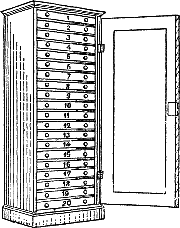 После ряда экскурсий мы собрали много различных камней и минералов, совершенно точно руководствуясь строгими законами сбора, о которых было рассказано. Затем мы определили наши камни — дали им их настоящее название. Таким образом, у каждого камня теперь уже есть свой собственный паспорт: откуда камень родом, когда и кто его нашел, как он называется и каким камням он сродни. Всё готово, чтобы составить коллекцию. Мы собирали ее вместе с товарищами по школе или по заводу, — давайте вместе и устраивать ее. Это можно сделать в школе, где уже есть небольшой музей, или на фабрике или заводе. Тут нашему молодому коллективу любителей минералогии всегда помогут, если участники коллектива возьмутся за дело серьезно и не бросят его на полдороге, как это часто бывает. Собрал с увлечением, даже разобрал дома, а потом… через полгода забыл, всё смешалось, увлекся лыжами или ботаникою, а образцы в один прекрасный день оказываются в углу комнаты, покрытые пылью и сором. Но вот всё готово для составления коллекции. Что нужно дальше сделать? Прежде всего надо обзавестись специальным шкафом для минералогических коллекций, — лучше всего, если наши коллекционеры умеют столярничать и сделают его сами. На этой странице вы видите такой шкафик — как бы комод: каждый ящик его невысок, сантиметров десять, не больше, а всего ящиков двадцать. В таком шкафу можно хранить до тысячи образцов камней, — это при умелом подборе уже большая коллекция. Если есть очень красивые камни, то хорошо было бы обзавестись и витриной со стеклянными стенками, — тогда можно часть камней и особенно кристаллов красиво выставить в таком шкафике-горке. Далеко не всегда можно обзавестись таким шкафиком с выдвижными ящиками, — тогда можно приспособить неглубокую полку, а чтобы камни не пылились, завесить ее занавеской или большими листами плотной бумаги. Пыль — сильнейший враг минералов: она так глубоко забирается во все извилины камня, что очистить камень далеко не просто, а мыть минералы не всегда можно, так как многие при этом растворяются и портятся.