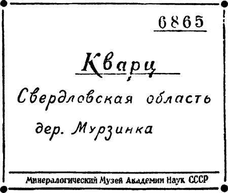 Когда помещение для коллекции готово, появляется новая забота, каждый камень непременно надо положить в отдельную коробочку, края которой не выше одного или полутора сантиметров. Несколько одинаковых камней или кристаллов можно положить вместе в одну коробку, если все они одного происхождения. В каждую коробку кладут этикетку — вырезанную по величине коробки бумажку, на которой написано, чья коллекция, как минерал называется, где он был найден, с точным обозначением места находки. На оборотной стороне надо надписать, кто и когда нашел этот минерал. На следующей странице дан образец такой этикетки Минералогического музея Академии наук. На тех подставках, на которых выставляют образец на показ, передняя сторона срезана наискось и на ней-то и делается надпись, но более коротенькая.