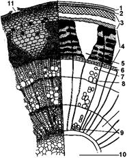 Рассмотрим строение древесного стебля двудольного растения на примере стебля липы (рис.21). Молодые (однолетние) побеги липы покрыты эпидермой. На поперечном срезе заметны первичная кора, флоэма, камбий, вторичная ксилема, примыкающая к пер-