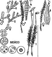 Кукушкин лен относится к двудомным растениям (рис. 67). На мужском гаметофите между бесплодными красноватыми (или желтоватыми) "листочками", образующими розетку, располагаются мужские половые органы — антеридии, в которых образуются двужгутиковые сперматозоиды. Антеридии имеют вид продолговатых или округлых мешочков на ножке. На женском гаметофите между верхними междоузлиями образуются женские половые органы — архегонии. В брюшке развивается яйцеклетка. Внутри шейки расположе