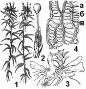 Отдел наиболее низкоорганизованных высших споровых растений, объединяющий около 25 тыс. современных видов. Для мхов характерно: © встречаются практически на всех континентах в самых разнообразных условиях; © предпочитают места обитания с повышенной влажностью; © жизненные формы — однолетние и многолетние травянистые растения; © в жизненном цикле преобладает гаметофит, представляющий собой "листостебельное растение"; настоящие стебли и листья отсутствуют, у мхов развиваются листовидные и стеблевидные структуры; © корни отсутствуют, их функцию выполняют нитевидные выросты в нижней части стебля — ризоиды; © представлены как однодомными, так и двудомными растениями; © антеридии (мужские органы полового размножения) представляют собой однослойные мешочкоподобные образования на ножке, заполненные сперматозоидными клетками, из которых образуется двужгутиковые сперматозоиды; архегонии (женские органы полового размножения) — бутылеобразные структуры, состоят из брюшка, содержащего яйцеклетку, и шейки; © для оплодотворения необходима вода; © из зиготы сначала развивается спорофит; он полностью зависит от гаметофита, так как получает от него воду и питательные вещества; © спорофит состоит из коробочки, в которой развивается спорангий, ножки (у некоторых мхов она может отсутствовать), на которой располагается коробочка, стопы, или гаустории, обеспечивающей связь с гаметофитом; © в спорангии в результате редукционного деления происходит образование гаплоидных спор; © моховидные — равноспоровые растения; © из спор образуется протонема, на ней закладываются почки, из которых развивается гаметофит.