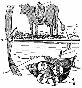 © Размножение и развитие. Половая система устроена сходно с таковой у ресничных червей; сосальщики — гермафродиты, но паразитический образ жизни привел к смене хозяев (в промежуточном хозяине возможно размножение по типу полиэмбрионии на личиночных стадиях развития). © Оплодотворенные яйца печеночного сосальщика по желчным протокам хозяина попадают в кишечник и вместе с фекалиями выходят во внешнюю среду. Для дальнейшего развития они должны попасть в воду, где из яйца выходит покрытая ресничками личинка — мирацидий. Она активно ищет промежуточного хозяина — малого прудовика — и внедряется в его внутренние органы. Здесь мирацидий теряет реснички и превращается в бесформенный мешок — спороцисту. Из зародышевых клеток в теле спороцисты развивается дочернее поколение личинок — множество редий. Редия имеет ротовое отверстие и пищеварительную систему.