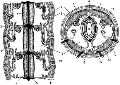 Тело червей состоит из сегментов. Наружной сегментации соответствуют разделение полости тела перегородками на отдельные камеры и посегментное расположение ряда внутренних органов. У многощетинковых червей на сегментах находятся примитивные конечности, несущие пучки щетинок. © Кожно-мускульный мешок. Образован кутикулой, однослойным эпителием и двумя слоями мышц — наружными кольцевыми и внутренними продольными. Внутренняя сторона продольных мышц выстлана эпителием мезодермального происхождения. Таким образом, полость тела ограничена не мышцами, как у круглых червей, а имеет свою эпителиальную выстилку (рис. 120). Такую полость называют вторичной (целомической). За счет целомического эпителия образуются двуслойные поперечные перегородки между сегментами. Вторичная полость разделяется на камеры, в каждом сегменте находится пара целомических мешков. Целомическая жидкость находится под давлением и играет роль гидроскелета. © Пищеварительная система состоит из передней, средней и задней кишки. В переднем и среднем отделах кишечника имеются дифференцированные участки (например, зоб, желудок), отсутствовавшие у предыдущих типов червей. © Органы дыхания. Дыхание осуществляется или всей поверхностью тела (малощетинковые черви), или с помощью жабр, расположенных на конечностях (многощетинковые черви). Жабры представляют собой выросты кожи, пронизанные кровеносными сосудами. © Кровеносная система замкнутая, то есть кровь движется по сосудам, не выливаясь в полость тела. Движение крови обуславливается пульсацией крупных сосудов, главным образом, опоясывающих пищевод. Кровь обеспечивает снабжение всех органов и тканей питательными веществами, транспортируя их от кишечника, и кислородом, поступающим в капилляры кожи из внешней среды. Важно запомнить, что по спинному сосуду кровь движется от заднего конца тела к переднему, а по брюшному сосуду — в обратном направлении. Оба сосуда посегментно соединены кольцевыми сосудами, охватывающими кишечник. Из них выделяются своей толщиной сосуды, окружающие пищевод, называемые сердцами. Железосодержащий белок, близкий к гемоглобину позвоночных и транспортирующий кислород, содержится в растворенном состоянии в плазме крови, эритроциты отсутствуют.