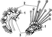 Органы выделения ланцетника называются нефридии и напоминают органы выделения плоских червей — протонефридии. Многочисленные нефридии (около ста пар, по одному на две жаберные щели), расположенные в области глотки, представляют собой трубочки, открывающиеся одним отверстием в полость целома, другим — в околожаберную полость (рис. 136). На стенках нефридия расположены булавовидные клетки — соленоциты, каждая из которых имеет узкий канал с мерцательным волоском. За счет биения этих волосков, жидкость с продуктами метаболизма выводится из полости нефридия в околожаберную полость. © Центральная нервная система образована нервной трубкой с полостью внутри. Выраженного головного мозга у ланцетника нет. В стенках нервной трубки, вдоль ее оси, располагаются светочувствительные органы — глазки Гессе. Каждый из них состоит из двух клеток — светочувствительной и пигментной, они способны воспринимать интенсивность освещения. К расширенной части нервной трубки прилегает орган обоняния. © Размножение и развитие. Ланцетники раздельнополы, половые железы (гонады, до 26 пар) расположены в полости тела в области глотки. Половые продукты выводятся в околожаберную полость через временно образующиеся половые протоки. Оплодотворение внешнее, зигота претерпевает дробление и превращается по классической схеме в морулу, бластулу, гаструлу, нейрулу. Имеется личиночная стадия. Личинка активно передвигается с помощью ресничек, покрывающих все тело, затем — за счет боковых изгибов тела. Личинка до трех месяцев ведет пелагический образ жизни, затем переходит к жизни на дне. Особенности строения, особенности эмбрионального развития, характерные для хордовых животных, были изучены русским ученым А. О. Ковалевским. Но достаточные основания считать ланцетников прямыми предками позвоночных животных отсутствуют. Они развивались по пути адаптаций к придонному образу жизни с фильтраторным типом питания. Бесчерепные животные сохранили ряд признаков беспозвоночных предков: ¨ выделительную систему нефридиального типа; ¨ отсутствие в пищеварительной системе дифференцированных отделов и сохранение внутриклеточного пищеварения; ¨ фильтрующий способ питания с образованием околожаберной полости для защиты жаберных щелей от засорения; ¨ метамерию (повторяющееся расположение) половых органов и нефридиев; ¨ отсутствие сердца в кровеносной системе; ¨ слабое развитие эпидермиса, он однослойный, как у беспозвоночных животных.