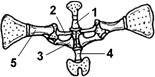 Задние конечности состоят из трех отделов: бедра, голени и стопы. Бедро состоит из бедренной кости, голень — из сросшихся большой и малой берцовых костей, стопа — из костей предплюсны, плюсны и фаланг пальцев. Плечевой пояс (рис. 145) лягушки широким полукольцом опоясывает тело и закрепляется в мускулатуре. Он представлен несколькими парными костями: лопатками, заканчивающимися широкими надлопаточными хрящами, вороньими костями и ключицами, а также одной непарной костью — грудиной (рис. 146). Тазовый пояс состоит из трех парных, сросшихся в связи с большими нагрузками костей: подвздошных, лобковых и седалищных. С помощью подвздошных костей тазовый пояс прикреплен к поперечным отросткам крестцового позвонка.