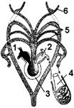 Легкие земноводных представляют собой полые мешки с более или менее выраженным ячеистым строением (рис. 148). Поверхность легких очень невелика, и отношение ее к поверхности кожи равно 2:3. Дыхательные пути тоже развиты слабо. У лягушки они представлены всего лишь короткой трахейно-гортанной камерой, а у представителей хвостатых — длинной трубкой — трахеей. Так как грудная клетка отсутствует, механизм дыхания — примитивного нагнетательного типа. Вдох осуществляется через ноздри, при опускании дна ротовой полости, затем ноздри закрываются клапанами, дно ротовой полости снова поднимается, и воздух проталкивается в легкие. Выдох происходит при помощи брюшной мускулатуры. Кроме легких, дополнительный газообмен осуществляется в ротовой полости, стенка которой пронизана сетью капилляров. © Кровеносная система разделена на два круга