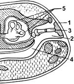 Для передачи звуковых колебаний стремечко одним концом упирается в барабанную перепонку, отделяющую полость среднего уха от внешней среды (рис. 150), а другим — в овальное окно, представляющее собой истонченный участок перегородки между средним и внутренним ухом. Полость среднего уха соединяется с ротовой полостью узким каналом — евстахиевой трубой, это необходимо для того, чтобы внешнее и внутреннее давления на барабанную перепонку были одинаковы, что предохраняет перепонку от разрыва. Орган зрения необходим амфибиям для рассматривания предметов, прежде всего на суше. Приспособления, необходимые для этого, выражаются в выпуклой форме роговицы и в хрусталике, имеющем форму двояковыпуклой линзы (в отличие от рыб, у которых шарообразный хрусталик). Кроме того, для защиты глаз от засорения и высыхания у амфибий появляются подвижные веки, мигательные перепонки, железы, увлажняющие роговицу. Аккомодация происходит, как и у рыб, лишь за счет перемещения хрусталика. Орган обонянияземноводных расположен в парных обонятельных капсулах, которые с внешней средой сообщаются наружными ноздрями, а с ротоглоточной полостью — хоанами, таким образом, описанная система служит не только для восприятия запахов, но и для дыхания. Боковая линиясвойственна всем личинкам амфибий и расположена в коже, но не в углубленном канале, как у рыб, а поверхностно. У взрослых форм боковая линия сохраняется только у водных хвостатых земноводных и некоторых бесхвостых, также водных. © Выделительная система, как и у рыб, представлена двумя туловищными почками, функция которых — выведение избытка воды. Основной продукт выделения — мочевина. По мочеточникам моча поступает в клоаку, а затем в мочевой пузырь. После его наполнения моча выводится снова в клоаку, а затем наружу. У самцов мочеточник выполняет еще одну функцию — функцию семяпровода. Амфибии — гиперосмотические животные по отношению к пресной воде. Вследствие этого вода постоянно поступает в организм через кожу, которая не имеет механизмов, препятствующих этому, как у других наземных позвоночных. Морская вода гиперосмотична по отношению к осмотическому давлению в тканях земноводных, вода через кожу уходит из организма. Это самая важная причина, вследствие которой земноводные не могут жить в морской воде и погибают в ней от обезвоживания. © Размножение и развитие. Половые различия между самками и самцами амфибий чаще всего выражены слабо. У большинства бесхвостых самцы несколько мельче самок. Самцы тритонов имеют яркую брачную окраску. Имеются также и изменения морфологического характера, например, у самца гребенчатого тритона в период размножения разрастается кожистая оторочка на спине и хвосте, а у самцов бесхвостых амфибий на внутренней стороне передних лапок образуется брачная мозоль. Оплодотворение может быть как внутренним, так и наружным. Развитие земноводных происходит с метаморфозом, то есть из яиц, которые обычно развиваются в воде, появляются личинки. Они питаются отличным от рациона взрослых кормом и отличаются от взрослых некоторыми рыбообразными чертами строения. Половые органы самца лягушки представлены парными семенниками. Семявыносящие канальцы впадают в мочеточник (вольфов канал). Оплодотворение у лягушки наружное, соответственно, копулятивные органы у самца отсутс