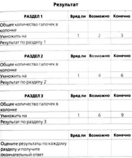 А теперь проверим результаты Мужскойрейтинг: 46 —109 Женскийрейтинг: 34 — 77 Это самый низкий брачный рейтинг, однако эти показатели легче всего улучшить — единственный путь ведет наверх! Люди, набравшие меньше всего баллов, не думают о своей внешности, статусе, способности заработать. Не думают они даже о собственном здоровье и благополучии. Люди из этой группы привлекают точно таких же неудачников и вполне счастливы с ними. Потенциальные партнеры не видят никакой необходимости меняться и, скорее всего, не читают эту книгу. Те, кто набрал максимальное количество баллов в этой категории, скорее всего, читают нашу книгу и хотят повысить свой брачный рейтинг, потому что хотят изменить свою жизнь. Люди, попавшие в эту группу, могут повысить свой брачный рейтинг, поработав над теми сферами, в которых набрали меньше всего баллов. Можно записаться на курсы, прочесть полезные книги, пойти в спортивный зал, посетить психологический семинар и т.п. Этим людям нужно поверить в себя и начать работать над собой. Совершенствуя свои показатели в каждой сфере по отдельности, они могут заметно улучшить свою жизнь. Мужской рейтинг: 110—215 Женский рейтинг: 78—150 Представители этой группы могут подняться выше или соскользнуть назад. Они могут иметь невысокий рейтинг, но, поработав над собой, быстро повышают свои показатели. Большая часть населения Земли относится именно к этой группе. И многим здесь вполне комфортно, потому что тут больше всего возможных партнеров. Для того чтобы перейти на следующий уровень, нужно напряженно работать над собой. Но если захотеть, это вполне возможно. Самые качественные партнеры находятся на самых высоких уровнях. Если человеку с таким рейтингом не нравится его внешность или другие данные, он может нанять персонального спортивного тренера, отправиться на семинар, прочесть книги, обратиться к стилисту, укрепить здоровье, записаться в клуб по интересам. Можно заняться благотворительностью, посещать курсы или проконсультироваться у психолога. Все это улучшит не только личную, но и профессиональную жизнь, что приведет к увеличению доходов и успеху в целом. Мужской рейтинг: 216—258 Женский рейтинг: 151—180 Люди с таким рейтингом уверены в себе и добились успеха. Они знают, чего хотят от жизни, и добиваются этого. Их рейтинг редко понижается, разве что в моменты серьезных кризисов. Впрочем, они умеют быстро восстановить утраченное. Если у человека этой группы возникает проблема, он быстро понимает это и предпринимает меры по исправлению ситуации. Такие люди всегда располагают средствами. К этой группе относятся кинозвезды, миллионеры, мировые лидеры, руководители крупных корпораций — и самые желанные партнеры для длительных отношений.