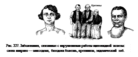 Гормоны аденогипофиза. Гормон роста — соматотропный гормон (СТГ). Недостаток этого гормона в детском возрасте тормозит рост, развивается заболевание гипофизарная карликовость, рост не превышает 130 см. Избыток гормона приводит к гигантизму, рост достигает 2,5 м и более. Если гормона вырабатывается больше нормы у взрослого человека, развивается акромегалия — при этом увеличиваются размеры ног, рук, лица. Тиреотропный гормон (ТТГ) — воздействует на щитовидную железу, адренокортикотропный (АКТГ) — на кору надпочечников. Фолликулостимулирующий гормон аденогипофиза (ФСГ) стимулирует образование половых клеток, лютеинизирующий (ЛГ) — образование половых гормонов. Пролактотропный гормон секретируется в конце беременности и приводит к выработке молока. Гормон промежуточной доли — меланотропин, отвечает за образование пигмента меланина в коже человека. Нейрогипофиз — выделяет вазопрессин, антидиуретический гормон (АДГ) и окситоцин, который вызывает сокращение матки при родах. 30.3. Щитовидная, паращитовидные железы,