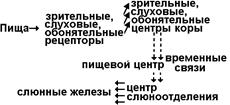К безусловным рефлексам относятся пищевые, дыхательные, оборонительные, половые, ориентировочные рефлексы. Определенную последовательность безусловных рефлексов, определяющую некоторые формы поведения, называют инстинктом. Примером инстинктивной деятельности является построение ловчей сети пауком-крестовиком, плотины бобрами. Для условных рефлексов характерно: © приобретаются организмом в течение жизни; © индивидуальные, формируются на основе личного жизненного опыта; © не имеют готовых рефлекторных дуг, дуги формируются при определенных условиях; © непостоянные, могут исчезать (тормозиться); © формируются на основе врожденных рефлексов в ответ на любое раздражение; © осуществляются за счет деятельности коры головного мозга. Образование условного рефлекса происходит при сочетании по времени безразличного раздражителя с безусловным. Безразличный раздражитель должен предшествовать безусловному. Тогда он становится условным. Для образования прочной временной связи необходимо многократное подкрепление условного раздражителя безусловным. Действие безразличного раздражителя приводит к появлению возбуждения в нервном центре коры, затем в другом нервном центре возникает возбуждение под действием безусловного раздражителя и между ними возникает временная связь. При повторных сочетаниях эта связь становится более прочной, вырабатывается условный рефлекс на данный раздражитель. Примером является выделение слюны в ответ на вид пищи, ее запах, на время кормления, на любой условный пищевой раздражитель.