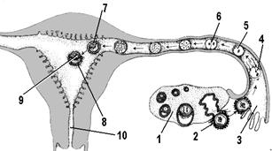 34.3. Менструальный цикл: Под действием фолликулостимулирующего гормона аденогипофиза один из фолликулов начинает развиваться и выделять эстроген. Эстроген подавляет выделение ФСГ аденогипофизом. Зрелый фолликул, называемый граафовым пузырьком, достигает 1 см в диаметре, лопается и овоцит 2-го порядка попадает в фаллопиеву трубу (рис. 251).