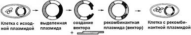 Традиционная селекция микроорганизмов (в основном бактерий и грибов) основана на экспериментальном мутагенезе и отборе наиболее продуктивных штаммов. Но и здесь есть свои особенности. Геном бактерий гаплоидный, любые мутации проявляются уже в первом поколении. Хотя вероятность естественного возникновения мутации у микроорганизмов такая же, как и всех других организмов (1 мутация на 1 млн. особей по каждому гену), но очень высокая интенсивность размножения дает возможность найти полезную мутацию по интересующему исследователя гену. В результате искусственного мутагенеза и отбора была повышена продуктивность штаммов гриба пеницилла более чем в 1000 раз. Продукты микробиологической промышленности используются в хлебопечении, пивоварении, виноделии, приготовлении многих молочных продуктов. С помощью микробиологической промышленности получают антибиотики, аминокислоты, белки, гормоны, различные ферменты, витамины и многое другое. Микроорганизмы используют для биологической очистки сточных вод, улучшений качеств почвы. В настоящее время разработаны методы получения марганца, меди, хрома при разработке отвалов старых рудников с помощью бактерий, где обычные методы добычи экономически невыгодны. Биотехнология — использование живых организмов и их биологических процессов в производстве необходимых человеку веществ. Объектами биотехнологии являются бактерии, грибы, клетки растительных и животных тканей. Их выращивают на питательных средах в специальных биореакторах. Новейшими методами селекции микроорганизмов, растений и животных являются клеточная, хромосомная и генная инженерия. Генная инженерия основана на выделении нужного гена из генома одного организма и введении его в геном другого организма. «Вырезании» генов проводят с помощью специальных «генетических ножниц», ферментов — рестриктаз, затем ген вшивают в вектор — плазмиду, с помощью которого ген вводится в бактерию (рис. 342). Вшивание осуществляется с помощью другой группы ферментов — лигаз. Причем вектор должен содержать все необходимое для управления работой этого гена — промотор, терминатор, ген-оператор и ген-регулятор. Кроме того, вектор должен содержать маркерные гены, которые придают клетке-реципиенту новые свойства, позволяющие отличить эту клетку от исходных клеток. Затем вектор вводится в бактерию, и на последнем этапе отбираются те бактерии, в которых введенные гены успешно работают. Излюбленный объект генных инженеров — кишечная палочка, бактерия, живущая в кишечнике человека. Именно с ее помощью получают гормон роста — соматотропин, гормон инсулин, который раньше получали из поджелудочных желез коров и свиней, белок интерферон, помогающий справиться с вирусной инфекцией.