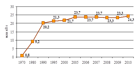 Рисунок 22 – Динамика мощности атомных электростанций России в 1970, 1980, 1990, 1995, 2000, 2005–2010 гг., млн кВт