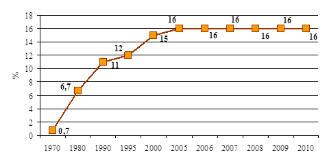 Рисунок 23 – Динамика удельного веса производства электроэнергии атомными электростанциями в общей выработке электроэнергии в России, в 1970, 1980, 1990, 1995, 2000, 2005–2010 гг., %