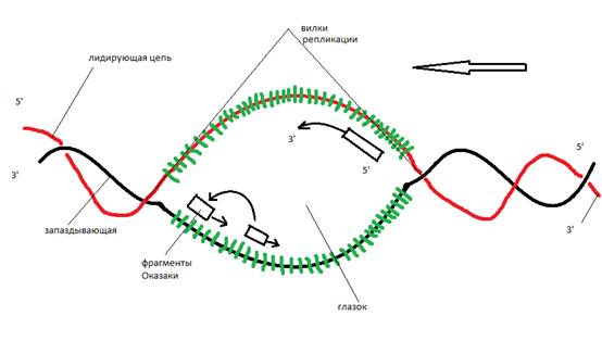 а)построение праймеров (с помощью праймазы) б)ДНК полимераза 3 вытесняет вспомогательные белки и начинает строить ДНК, использующий, как затравку, праймер. Цепь, где идёт построение в правильном направлении и для которой достаточно одного праймера, называется лидирующей. Цепь, строющаяся через фрагменты Оказаки, называются запаздывающие.