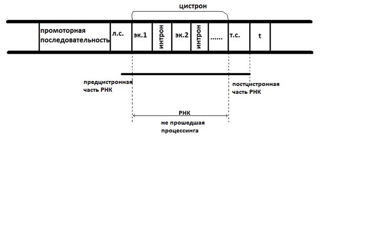 Билет 1)инициация Сигма субъединица находит промотор, затем к ней присоединяется субъединица ДНК полимеразы и раскусывает цепи. 2)Элонгация Если оператор разрешает присоединится, то ДНК полимераза строит РНК. 3)Терминация Подходят специальные белки, которые помогают закончить процесс. Билет 1)для присоединения надо много белков 2)считывает в помощью движения 3)нужны специальные белки терминации 4)Много РНК полимераз Билет Процессинг состоит в: 1)модификации предцистронной зоны и присоединения КЭПА (особой нуклеотидной последовательности) (защита 5’конца) При кэпировании происходит присоединение к 5'-концу транскрипта 7-метилгуанозина посредством трифосфатного моста, соединяющего их в необычной позиции 5'-5', а также метилирование рибоз двух первых нуклеотидов. Процесс кэпирования происходит во время транскрипции молекулы пре-мРНК. Кэпирование защищает 5'-конец первичного транскрипта мРНК от действия рибонуклеаз, специфически разрезающих фосфодиэфирные связи в направлении 5’→3'.[1]:221