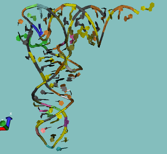 Общие принципы складывания цепей различных тРНК в компактную третичную структуру оказались универсальными. За счет взаимодействия элементов вторичной структуры формируется третичная структура, которая получила название L-формы из-за сходства с латинской буквой L (рис. 2 и 3). За счет стэкинга оснований акцепторный стебель и T-стебель клеверного листа образуют одну непрерывную двойную спираль (одну из "палочек" - доменов буквы L), а два других стебля - антикодоновый и D - другую непрерывную двойную спираль (второй домен L). При этом D- и T-петли оказываются сближенными и скрепляются между собой путем образования дополнительных, часто необычных пар оснований. В образовании этих пар, как правило, принимают участие консервативные или полуконсервативные остатки. В свете этого становится ясным, зачем они присутствуют в D- и T-петлях. Аналогичные третичные взаимодействия скрепляют и некоторые другие участки L-структуры. CCA-конец тРНК и ее антикодоновый триплет находятся на максимальном удалении один от другого (расстояние около 8 нм), причем основания антикодона обращены внутрь угла L-образной молекулы. Любители загадочных картинок могут проследить ход нуклеотидной цепи тРНК в трехмерной структуре на рис. 3, основываясь на схематическом изображении рис. 2, б. Количество рРНК в каждой субъединице