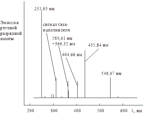 Методы атомного уровня позволяют определить, атомы каких элементов и в каком количестве содержатся в исследуемом образце. Кроме основных элементов, природные энергоносители в том или ином количестве содержат практически все элементы периодической системы. Согласно ГОСТ эти элементы, составляющие в основном минеральные примеси в природных энергоносителях, делятся на пять групп: 1. Элементы процентного содержания нетоксичные; 2. Элементы процентного содержания токсичные; 3. Микроэлементы (содержатся в количестве 0,01-1 мас. %); 4. Редкие элементы нетоксичные (содержание менее 10-4 мас. %); 5. Редкие элементы токсичные (содержание менее 10-4 мас. %). Метод атомной адсорбции основан на эффекте резонансного поглощения определенной длины волны свободными атомами определяемого элемента при прохождении светового излучения через атомный пар исследуемого образца. Атомы элемента, находящиеся в невозбужденном состоянии, способны селективно поглощать световую энергию определенной длины волны, переходя из нижнего (основного) состояния в верхнее - возбужденное состояние. Обратный процесс перехода атомов из возбужденного состояния в основное сопровождается испусканием характеристического спектра конкретного атома. Это характеристическое излучение используется для качественного (поскольку спектр каждого элемента неповторим) и количественного анализа в методе атомной эмиссии. Поскольку атомы в атомном паре фактически изолированы друг от друга, их спектры состоят из узких линий, шириной обычно менее 0,1 Å. Кроме того, атомные спектры чрезвычайно просты, особенно у легких элементов. На рис. 9.1 указаны выделяющиеся характеристические линии в спектре атомов ртути. Эмиссионная линия газа-наполнителя вызвана возбуждением инертного газа, присутствующего в ртутной разрядной лампе. Даже если в пробе присутствуют несколько элементов, их идентификация возможна, потому что каждый элемент дает характеристический спектр узких линий, которые практически не накладываются друг на друга. Количественные зависимости атомной спектроскопии описываются известным законом Бугера-Ламберта-Бера: