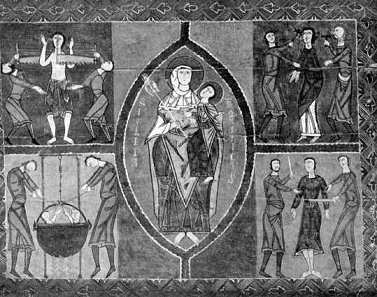 Внутри храма член общины ощущал себя в особой замкнутой среде, где все напоминало о вере, где не оставалось места земному, а о небесном рассказывалось доступным и выразительным языком живописи. Там, в отличие от музея, никогда не нарушалась особая атмосфера, присущая средневековому искусству, где в единое целое сливались зодчество, скульптура и живопись. Не слишком умелые в деталях, романские мастера достигали совершенства в общем, умея находить гармонию между внешним обликом здания и тем, что происходило внутри. В абсидах обычно размещались самые торжественные и отвлеченные образы: в конхе – Христос Пантократор или Богоматерь Во Славе, в окружении ангелов, серафимов и символов евангелистов, верхний ярус стены абсиды под конхой занимали представленные строго фронтально апостолы и святые. Росписи стен отличались более свободным характером, поскольку имели второстепенное значение в убранстве храма. Чаще всего это были сцены из Апокалипсиса, жизни святых мучеников, но изредка встречались и вовсе удивительные картины. Так, в одной из церквей прихожане взирали на вавилонского царя Навуходоносора и развлекающих его жонглеров, чуть ниже располагались изображения верблюдов. Каталонские росписи являлись фресками лишь отчасти, поскольку по сырой штукатурке выполнялся только первый слой картины, тогда как остальное художник писал темперными красками на сухой поверхности. Техника темперы не допускала смешения красок, поэтому живопись радовала взор ярким колоритом, возникавшим из сочетания чистых тонов, применявшихся в простых нерезких сочетаниях.