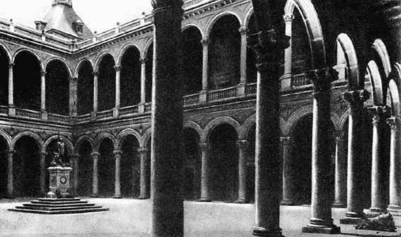 Западный фасад не имел официального значения и потому отделывался гораздо более простыми средствами. Самой запоминающейся деталью здесь стали открытые аркады балкона на верхнем этаже. В украшении восточного фасада зодчий использовал фрагменты старого дворца. Благодаря тяжелой кладке камней, зубцам на кровле и полукруглым башням с глухими стенами в облике здания ощущался средневековый дух. Отделку южной стороны Алькасара завершили потомки Карла V. Архитектор Филиппа II, будущий создатель Эскориала Хуан де Эррера пренебрег планом Коваррубиаса, взяв за основу декора суровую статичность собственной манеры. С того времени южный фасад дворца имел четыре этажа. Нижний уровень был украшен десятью тяжелыми арками, а другие – огромными сдвоенными по углам пилястрами дорического стиля. Нарочито ровные поверхности оживляли окна различной величины: крошечные проемы чередовались с большими, сделанными по подобию балконов. Похожие окна были устроены в башнях восточного фасада. Внутренний двор Алькасара производил незабываемое впечатление гармонией форм и деталей декора. Построенный еще по старому проекту, он представлял собой прямоугольник, обнесенный двухэтажной колоннадой с полукруглыми высокими арками и сдвоенными на углах колоннами коринфского ордера. На нижних арках размещались гербы Габсбургов в виде орлов. Сегодня вклад Эрреры в облике двора почти незаметен; видимо, зодчий был удовлетворен его строгостью и согласился сохранить живое изящество платереско. По желанию Филиппа на южной стороне площадки появилась лестница, задуманная Коваррубиасом, но исполненная вопреки его манере в сухом торжественном стиле. Из дворика можно пройти в просторный вестибюль дворца, где в старину никогда не бывало пусто. В отличие от католических кастильские короли не представляли себя посланниками Бога и напрямую принимали посетителей, правда, большую их часть составляли священники. Духовенство испанского Толедо потратило немало сил на борьбу с мусульманской культурой, но преуспело лишь в области религии. В светской жизни восточное начало проявлялось гораздо сильнее, о чем свидетельствуют памятники архитектуры, по которой можно судить о пристрастии испанцев к мавританскому зодчеству. Эмоциональные кастильцы прельщались игрой линий, изяществом арок в виде подковы, стройностью тонких колонн, обилием декоративных украшений. К последним относились разноцветная лепнина из гипса, блестящий кафель, тонкая резьба деревянных потолков, часто дополненных архитектурными сталактитами. Все эти элементы придавали постройкам праздничный вид, согласовавшийся с живым испанским характером гораздо больше, чем суровый облик романского зодчества. Впрочем, мавританские мастера охотно использовали новейшие европейские идеи и не забывали о старых традициях, в том числе римских. Итогом переработки разнообразных приемов стал мудехар – художественный стиль, который лирики именуют испанским романсом в камне. Его сторонники соединяли в своих произведениях и тяжелые романские, и устремленные ввысь готические формы. Зодчие успешно использовали арочные своды, пинакли, всевозможные арки.