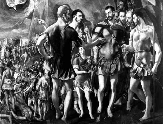 Покорность северных племен выражалась регулярными поставками монет, зерна и шерстяных плащей для армии. По достоверным сведениям, в 198 году н. э. по Серебряному пути было переправлено 50 тысяч фунтов серебра и немногим менее 2 тысяч фунтов золота. Относительно других металлов информация слишком противоречива, однако известно, что всеми рудниками, кроме золотоносных, владели частные лица, безусловно, иностранцы. При добыче свинца, железа, олова, меди, наряду с рабским, использовался труд свободных иберов, о чем поведал потомкам автор каменного рельефа из Лузитании. Послушание общин вознаграждалось союзным договором, предоставлявшим некоторые права, например разрешение чеканить собственную монету. В Саламанке свои деньги не выпускались, но у римлян имелись основания хорошо обращаться с жителями города, через который шли потоки ценного груза. С начала III века н. э. власти перестали пользоваться услугами иберийских наемников, зато потребовали от вождей направлять в римские войска целые отряды. Облик и снаряжение древнего испанского воина нетрудно представить, рассматривая статуэтки из саламанкских гробниц. Выполненные из гранита, чаще грубой работы и к тому же плохо сохранившиеся, они явно создавались по трафарету. Изображенные воины были одеты только в удлиненные куртки, подпоясанные на талии. Вооружение составляли крепившиеся на правом боку укороченные мечи, кинжалы, неведомым образом державшиеся на животе круглые щиты и похожие на сабли кривые, тоже короткие мечи. Фигуры на гранитной пластике изображались так, словно их ноги до щиколоток тонули в плите. В данном случае обувь увидеть нельзя, а возможно, ее и не было вовсе, ведь не случайно испанские художники золотого века всегда изображали римлян босыми. Именно такими видел завоевателей Эль Греко. Каноны живописи XVI века не допускали реализма, и мастер, взяв для картины «Мученичество святого Маврикия» библейский сюжет, не собирался нарушать правила. Однако в образах фиванского полководца и его соратников присутствуют черты иберийских вождей: именно их, а не чужаков, сделал главными героями великий испанский живописец. В отличие от гранитных бронзовая пластика имеет более четкие формы. Здесь вооруженные кривыми мечами воины представлены в тех же длинных куртках. Их головы покрывают каски с гребнями, тела обвивают портупеи, а в свободных от оружия руках – большие чаши для Святых Даров. На отдельных фигурах шлемы отсутствуют как, впрочем, и одежда: напоминая картину Эль Греко, обнаженные воины держат щит и кривые мечи поперек тела. В особую группу следует выделить бойцов, по греческой традиции облаченных в плащи; оставляя открытым одно плечо, все они удерживают копье правой рукой, тогда как их круглые щиты подвешены за спиной.