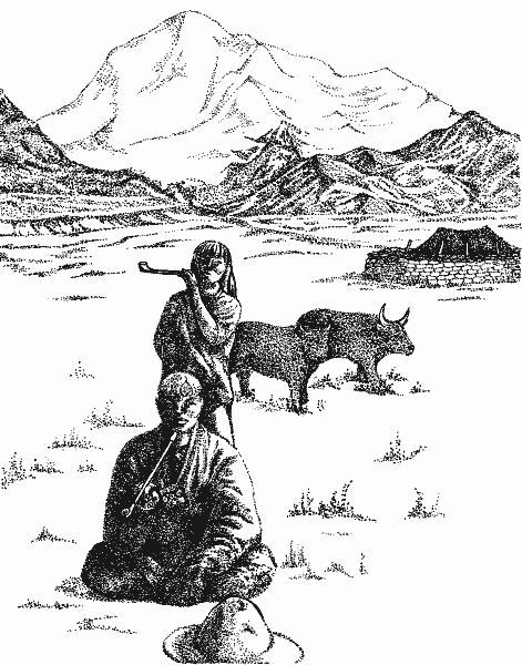 Помимо вертушек и кругового шествия, религиозный экстаз выражался простой, но крайне неудобной формой передвижения: воздевая руки над головой, человек сводил их на груди, опускался на колени, падал на землю, приподнимался, продвигаясь до места, где легли кончики пальцев, и вновь падал ниц. Для того чтобы проползти в молитве улицу Лингкор, требовалось около 5 тысяч таких движений. От неминуемых ран кожу спасали шерстяные наколенники и чехлы на руках, отдаленно напоминавшие варежки. Особо фанатичные буддисты не ограничивались кругами Лхасы, приползая в священный город из отдаленных районов Тибета, Непала, Бутана и даже из Монголии. Своей наружностью и характером тибетцы напоминают исконных обитателей американских прерий: резко очерченные лица, прямые черные волосы, горделивая осанка, настороженность, вызванная постоянной готовностью к схватке с врагом. Типично тибетское лицо похоже на рельеф из слоновой кости; пронизывающий взгляд маленьких глаз дополняется волевыми складками у рта и подбородка. Национальная одежда тибетцев называется «чуба», но, в отличие от привычной шубы, шьется из различных материалов – овчины, сукна, шелка или домотканого полотна. Раньше представители степных районов предпочитали мотыге оружие, а добротной одежде – украшения; золотые либо медные перстни, серьги, браслеты носили и женщины, и мужчины. Просторный, теплый халат бедняка имел единый размер, поэтому годился для человека любого возраста и комплекции. Перехваченный в поясе ремешком, он едва достигал колен, исполняя роль одежды и сумки. В карман, образованный напуском над талией, можно было складывать необходимые в течение дня вещи, например деньги, огниво, персональную миску, четки, кинжал.