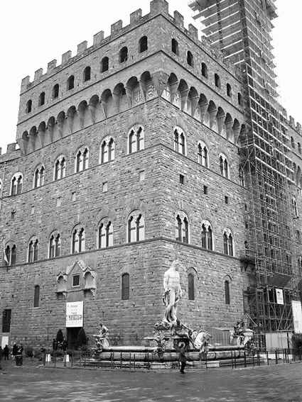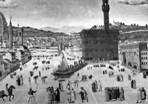 В настоящее время бывшая резиденция комунны, подобно мосту, именуется просто Старым дворцом (итал. palazzo Veccio), поскольку его политическая роль была утрачена вместе с властью Синьории. Уже давно не кипят страсти и на прилегающей к нему площади, хотя та прежнее название сохранила, оставшись «самым идейным местом Флоренции», как охарактеризовал ее один из мыслителей Ренессанса, помня о бурных страстях, кипевших на площади Синьории (итал. piazza Signoria) во времена гвельфов. После разгрома гибеллинов летом 1289 года они разрушили все находившиеся на площади дома противников, а руины посыпали солью, дабы никто не смел ходить по проклятому месту. Однако вскоре прижимистые флорентийцы одумались и сочли, что соляной пустырь в центре города – слишком расточительно, и площадь была восстановлена в былом виде. С возведением приорского дворца вернулось и ее прежнее значение. С тех пор на площади Cиньории проходила обычная, к несчастью, не всегда высокодуховная городская жизнь. Здесь правители оглашали указы и устраивали торжественные церемонии, сюда народ сбегался, чтобы поучаствовать в пополанских мятежах или поглазеть на казни: преступников по‑итальянски вешали в окнах дворца или по‑инквизиторски сжигали. Интересным зрелищем была казнь особо опасных еретиков. К таким применялись обе меры, как получилось с проповедником‑доминиканцем Джироламо Савонаролой. Любимец народа, он страстно желал преобразовать флорентийское государство, а вместо того, измученный долгими пытками, повис в оконном проеме с петлей на шее, а затем уже мертвым был брошен в костер. Это жуткое событие произошло 23 мая 1498 года, и подробности о нем можно узнать на той же площади, прочитав надпись на бронзовом диске, вмурованном в мостовую перед фонтаном «Нептун». После ухода республиканцев и водворения великих герцогов обширное пространство наконец обрело статус главной площади Флоренции. Ее важность подтверждали не только выходы монархов, парады и праздники, но и великолепное скульптурное убранство.