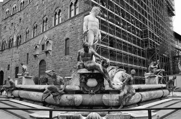 Беломраморная, несмотря на солидный возраст, фигура морского царя резко выделяется на фоне желтовато‑серых стен палаццо Веккио. Окруженный всяческими животными, от морских гадов до выхоленных лошадей, Нептун возвышается посреди фонтана, созданного, как и статуя, в конце XVI века Бартоломео Амманати. Этот ваятель был довольно известен при жизни и практически забыт потомками из‑за того, что не создавал шедевры, а просто работал на заказ, добросовестно, но без божьей искры. Его невыразительное произведение не произвело фурора и к тому же появилось на главной площади Флоренции в неудачный момент, накануне свадьбы наследника трона Франческо, вскоре после знаменитого «Давида» Микеланджело. Тем не менее Нептун с кудрявой бородой и задумчивым лицом выдержал жесткую конкуренцию, благополучно дожил до наших дней и, в отличие от соперника, которого в свое время перенесли под крышу, установив на пьедестале копию, сумел сохранить белизну тела без посторонней помощи.