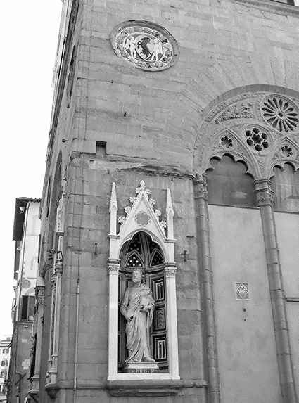 Являясь памятником раннего Возрождения, церковь Сан‑Микеле ин Орто – символ цехового тщеславия флорентийцев. Мало того, что заказчики пригласили для отделки невзрачного здания всех проживавших на тот момент в городе именитых скульпторов, они еще и пожелали видеть всех своих покровителей, а тех оказалось больше, чем места на фасаде, ведь у каждой гильдии имелся свой святой. Не желая уступать друг другу право быть благотворителем, 14 гильдий поступили очень просто: взяли и поделили фасад, отведя место всем святым, правда, выстроив их в плотный ряд. Церковно‑цеховые страсти кипели в начале XV века, когда империя и папство утратили свои былые роли, и вместе с тем начала затухать борьба гвельфов с гибеллинами. На улицах перестала литься кровь, горожане успокоились, и республика обрела стабильность, что позволило Флоренции сохранить до наших дней такое изобилие памятников. Интересно, что никакие войны не мешали местному культурному обществу стремиться к совершенству, напротив, даже помогли достичь его в литературе благодаря «Божественной комедии» и любовной лирике Данте, как известно, бежавшего из Флоренции во время очередной стычки «белых» и «черных». Кто знает, смог бы великий поэт создать проникновенные строки, если бы не оказался в изгнании и не испытывал бы такой пронзительной тоски по родине. В те годы совсем близко к идеалу подошла живопись, чему город обязан своему почетному гражданину, гениальному иконописцу Джотто ди Бондоне. Когда художники заинтересовались земным миром, он не отказался от канонов церковного искусства, но все же сделал шаг в сторону реализма, наделив своих героев подчеркнутой материальностью, сделав их объемными и даже несколько грузными. Привычные библейские персонажи у Джотто имели характер, который раскрывался через облик человека, чаще благородного, доброго, нравственно чистого, преисполненного человеческого достоинства.