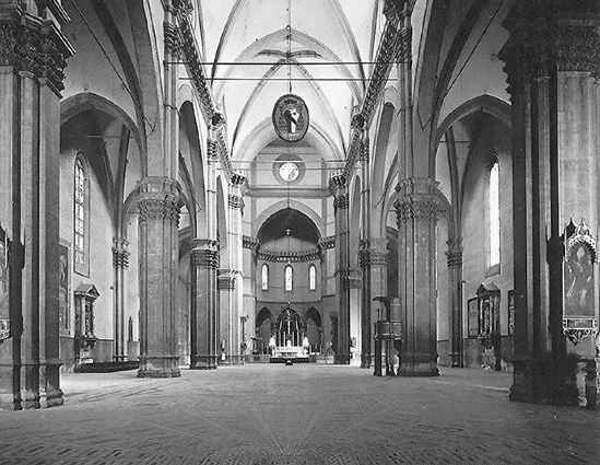 До него никто не знал, как накрыть огромное пространство главного зала Санта‑Мария дель Фьоре, используя известные приемы. Взявшись за эту, казалось, невозможную задачу, Брунеллески предложил решение, оригинальное с технической стороны и великолепное эстетически: составленный из двух оболочек восьмигранный купол поддерживала система связанных между собой арок‑нервюр. Облицованное кирпичом, его сооружение не нуждалось в лесах и состояло из двух оболочек, связанных нервюрами и горизонтальными кольцами. В готовом виде купол Брунеллески пленял легкостью, гибким упругим контуром, а вознесшись над городом, определил характерный силуэт Флоренции. Несмотря на грандиозные размеры (высота 91 м, диаметр 45,5 м), он выглядел так, словно парил в воздухе. Зодчий не захотел расписывать свод, но в 1572–1579 годах фрески, исполненные художниками Вазари и Дзуккари, все же на нем появились. В последнее время все чаще и чаще раздаются голоса в пользу первоначального проекта, то есть купола безо всякой живописи. Власти города готовы его осуществить, однако для того, чтобы уничтожить старинные картины, возвратив своду первозданную белизну, нужен решительный, талантливый мастер, каким в свое время был Брунеллески и каких во Флоренции не рождалось со времен Ренессанса.
