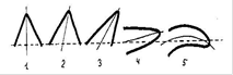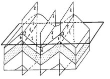 Основные элементы складки: 1 – крыло складки, 2 – осевая поверхность складки, 3 - угол при вершине складки, 4 – ось кладки (линия пересечения осевой поверхности с горизонтальной плоскостью), 5 - шарнирная линия складки, 6 – замок складки.