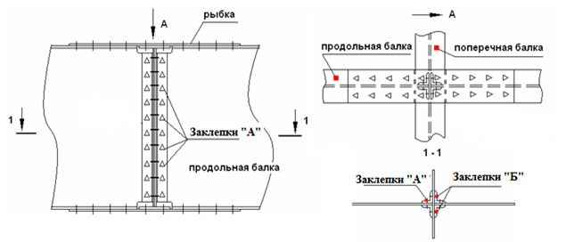 Класс по прикреплению продольной балки к поперечной устанавливается по результатам следующих расчетов: · на прочность заклепок, соединяющих уголки прикрепления с продольной балкой; · на прочность заклепок, соединяющих уголки прикрепления с поперечной балкой; · на прочность и выносливость “рыбки” и на прочность ее прикрепления.