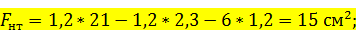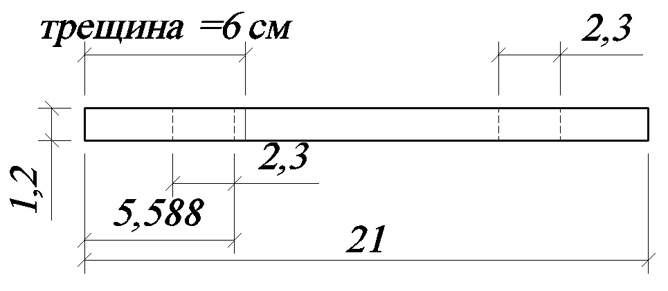 Площадь нетто сечения рыбки (ширина пояса – 21 см, ослабление – 2 отверстия под заклепки диаметром 2,5 см, трещина длиной 6 см)
