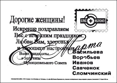 Листовки относятся к виду письменных материалов, в равной степени широко используемых как в рекламе, так и в целях передачи информации от службы по связям с общественностью. Широкое использование листовок объясняется тем, что распространение любой информации с их помощью является самым быстрым и дешевым способом. Их раздают на улице, в магазинах, в метро, их можно получить на семинарах и конференциях и в других местах, где проводятся массовые мероприятия. Обычно это листок бумаги размером А4 или меньшего формата, текст на котором напечатан либо на одной стороне листа, либо на обеих. Листовку складывают только в том случае, если она распространяется по почте, – для нанесения адреса непосредственно на ней, на обратной стороне текста. Очень часто листовка помимо текста содержит логотип фирмы или иллюстративный материал, но связь между иллюстрацией и текстом должна быть ясна и прозрачна. При написании текста для листовки следует всегда иметь в виду объем информации, которую вы хотите разместить, и общий размер листовки. Если ваша листовка носит чисто информационный характер (что? где? когда?), используйте крупный шрифт, поскольку текст не займет много места, если же в ней даются подробные сведения о событии или продукции, тогда примените более мелкий шрифт и иллюстрации меньшего размера. Листовки обычно размножаются в самой организации средствами ксерографии; высокая печать (офсет) используется лишь в тех случаях, когда они выпускаются на глянцевой бумаге и требуется хорошее воспроизведение цветовой гаммы Иногда предвыборная листовка имеет несколько завуалированный характер с точки зрения ее целенаправленности. Так, приводимое поздравление женщин района с праздником 8 Марта (рис. 5) можно было бы рассматривать как вполне искреннее побуждение, если бы 14 марта не предстояли очередные выборы и листовка не была бы подписана кандидатами в депутаты муниципального совета.