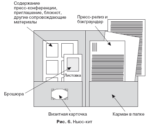 Как и в сочетаниях со словом «релиз», стоящие в подзаголовке слова в широком смысле являются синонимами и называют один и тот же предмет – «папка с информационными материалами для средств массовой информации». Разница между ними заключается в том, что тогда как в термине «ньюс‑кит» подчеркивается новостной характер содержащихся в папке материалов, сочетания с «пресс» и «медиа» подчеркивают адресную направленность этой папки – для печатных средств информации или для всех без исключения СМК, включая радио, телевидение, Интернет. Как и в случае сочетания этих определяющих слов со словом «релиз», в дальнейшем изложении повсеместно будет использовано сочетание «ньюс‑кит». Общепризнано, что одним из наиболее широко принятых и надежных путей распространения информационных материалов является ньюс‑кит (рис. 6). Иногда ньюс‑кит еще называют «информационный кит».