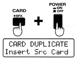 1. Подготовьте источник копирования и пустую карту такого же объёма памяти. Карта размещения копии должна быть отформатирована. 2. Удерживая в секции BANK кнопку [CARD], нажмите кнопку [POWER] в положение включения питания. На дисплее появится следующее сообщение