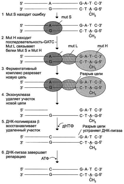 Рис. 4-21. Система репарации ошибок репликации. 1 - белок mut S "узнаёт" некомплементарную пару и присоединяется в этом участке ДНК; 2 - белки mut H взаимодействуют с метилированной по аденину последовательностью материнской цепи -GATC-; завершается формирование ферментативного комплекса после присоединения mut L; 3 - комплекс определяет вновь синтезированную цепь по отсутствию метилированного остатка аденина в последовательности -GATC- и разрывает её; 4 - экзонуклеаза удаляет фрагмент дочерней цепи ДНК, содержащий ошибку; 5 - ДНК-полимераза β по принципу комп-лементарности застраивает брешь; 6 - ДНК-лигаза З'-конец вновь синтезированного фрагмента соединяет с основной цепью и завершает репарацию ошибки. фермент - АП-экзонуклеаза, который отщепляет от цепи дезоксирибозу, лишённую основания (третий этап). В цепи ДНК появляется брешь размером в один нуклеотид. Следующий фермент ДНК-полимераза р к З'-концу разорванной цепи присоединяет нуклеотид по принципу комплементарности (четвёртый этап). Чтобы соединить два свободных конца (3'-конец встроенного нуклеотида и 5'-конец основной цепи), требуется ещё один фермент - ДНК-лигаза (пятый этап). Нерепарйруемо и поэтому опасно дезаминирование метилированного цитозина. Продукт его спонтанного дезамжнирования - тимин,