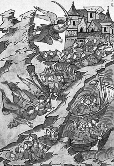 Невская битва. Войско Александра Невского сокрушает шведов. Миниатюра Лицевого Летописного Свода