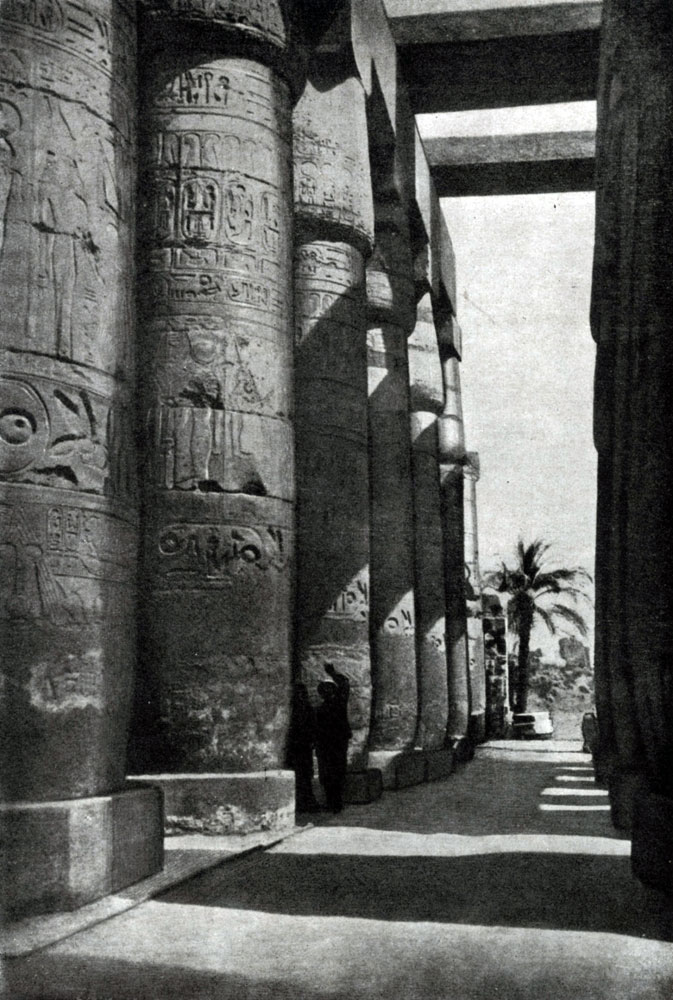 Уже на примере Карнака видно то стремление к грандиозным масштабам, которое стало определяющей чертой храмовой архитектуры XIX династии и было продиктовано стремлением новых царей затмить все построенное до них. Никогда еще пилоны, колонны и монолитные колоссальные статуи царей не достигали таких размеров, никогда еще убранство храмов не отличалось такой тяжелой пышностью. Так, новый гипостиль Карнака, являющийся величайшим колонным залом мира, имеет 103 м в ширину и 52 м в длину. В нем сто сорок четыре колонны, из которых двенадцать колонн среднего прохода, высотой в 19,25 м (без абак), имеют капители в виде раскрытых цветов папируса, подымающихся на стволах, каждый из которых не могут обхватить пять человек. Воздвигнутый перед гипостилем новый пилон превзошел все прежние: длина его равнялась 156 м, а стоявшие перед ним мачты достигали 40 м в высоту. Строителями этого гипостиля были зодчие Иупа и Хатиаи. Достаточно велик был и новый пилон с двором, окруженным семьюдесятью четырьмя колоннами, который был выстроен при Рамсесе II зодчим Бекенхонсу перед Луксором, вторым святилищем Амона в Фивах. Той же монументальностью отличались и заупокойные царские храмы на западном берегу. Из них следует особо упомянуть храм Рамсеса II, так называемый Рамессеум (зодчий Пенра), в первом дворе которого стояла колоссальная статуя царя — величайшая монолитная скульптура, весившая 1000 тонн и имевшая около 20 м в высоту. Основные принципы оформления храмов были также восприняты зодчими XIX династии от их предшественников, но это наследие было ими переработано. Продолжая развивать роль колонн, они создали ставшее впоследствии образцом обрамление средних, более высоких проходов гипостилей колоннами в виде раскрытых цветов папируса, сохранив для боковых проходов колонны в виде связок нераспустившихся стеблей. Эти гипостили словно воспроизводили нильские заросли, где расцветшие стебли папирусов возвышаются над еще не успевшими распуститься. Такая трактовка гипостиля хорошо сочеталась с общей древней символикой храма как дома божества, в данном случае — бога солнца, которое по египетскому преданию рождается из цветка лотоса, растущего в речных зарослях. Крылатый солнечный диск обычно и изображался над дверью пилона. Стремление придать зданию возможно большую пышность привело к перегруженности: тяжесть огромных перекрытий вызвала увеличение объема колонн и слишком частое их расположение, рельефы и тексты начали покрывать не только стены, но и стволы колонн. Роль скульптуры в архитектурном убранстве храмов осталась, в общем, прежней. Как и раньше, перед пилонами и колоннами и между колоннами ставились колоссальные царские статуи. Однако не эти статуи, решенные, как всегда, крайне суммарно, определили стиль скульптуры XIX династии. Его особенности гораздо яснее выступают в статуях, стоявших внутри храмов и гробниц. Вначале в них также заметно прямое возвращение к доамарнским памятникам. Восторжествовавшие над «ересью» Эхнатона представители знати и жречества хотели видеть свои изображения такими же изысканными и нарядными, какими были статуи их предков. Снова появились струящиеся линии одежд и париков и дробная игра светотени. Увлечение внешней нарядностью все более росло, подавляя реалистические искания, которые были в скульптуре конца XVIII дина