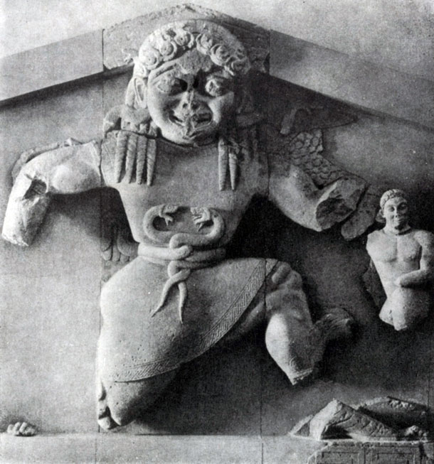 Такой характер имел, например, рельеф на фронтоне храма Артемиды на острове Корфу (первая половина 6 в. до н.э.), очень плоскостный и примитивный. В центре Этого фронтона находилась большая фигура летящей горгоны Медузы с двумя симметрично расположенными лежащими пантерами по сторонам от нее; по углам фронтона были изображены битва Зевса с гигантом и сидящая Гея. Таким образом, фронтон этот не был посвящен единому событию, а объединял различные (и данные к тому же в очень разных масштабах) фигуры, связанные лишь общим декоративным замыслом. «Коленопреклоненный бег» Медузы изображал ее полет по той же схеме, что и в «Нике» Архерма.