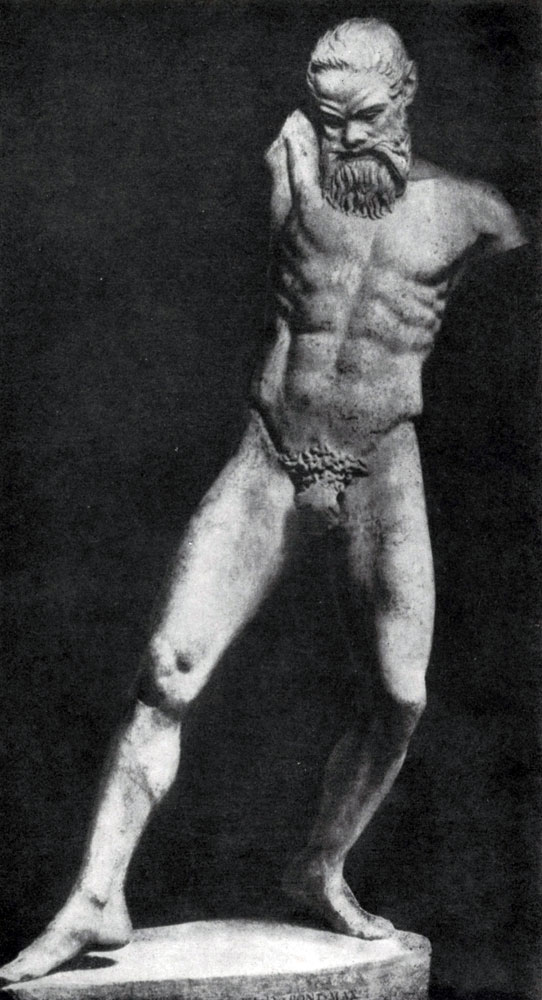 Создание правдивого и глубоко значительного типического образа человека как нормы и образца для каждого человека-гражданина имело для греческой классики большее значение, чем раскрытие индивидуального человеческого характера. В этом заключалась огромная сила и вместе с тем границы реализма греческой классики. Поэтому и в олимпийских скульптурах вполне реальные и различные душевные состояния носят обобщенный характер, в них нет сколько-нибудь сложных и психологически углубленных переживаний. С этим связана и следующая особенность греческой скульптуры и вообще греческого изобразительного искусства ранней и высокой классики: лицо человека еще не заняло по отношению к человеческому телу преимущественного или исключительного права на передачу душевной жизни. Она в равной мере выражена во всем теле, во всех его движениях, включая и мимику лица. Эта особенность в значительной мере определила и своеобразный характер развития портрета в греческой классике. Первоначально наиболее распространенным видом портретной (по своему назначению) скульптуры была статуя победителя на олимпийских состязаниях. Но победитель, с точки зрения древних греков, удостаивался статуи за то, что своей победой утверждал славу родного города, за то, что он выступал как мужественный и примерный гражданин, становясь образцом для других. Статуя победителя заказывалась городом-государством для прославления победителя, но вместе с тем и для прославления города, представителем которого на состязаниях был победитель. Естественно, что именно в таком плане он и изображался художником. Доблестный дух в гармонически развитой теле - это считалось самым ценным в человеке. Но этими свойствами греческий юноша, участник олимпийских игр, реально и обладал. Поэтому, вероятно, и общину и самого победителя вполне удовлетворяло то, что его имя стояло на постаменте, на котором возвышалась типически-обобщенная прекрасная статуя. Первые портреты в собственном смысле слова, которых удостаивались граждане, выдающиеся своими заслугами перед полисом и избранные на одну из самых почетных и ответственных общественных должностей, также были еще лишены резко выраженной индивидуальной характеристики. Портрет стратега (в Мюнхенской глиптотеке) дает нам представление о портрете этого периода: формы лица переданы очень обобщенно и просто, с суровой выразительностью. Художник создал образ государственного деятеля, спокойного и решительного, но этот образ не передает неповторимых черт характера именно данного человека. Да и признаки ярко выраженного внешнего сходства вряд ли занимали скульптора. С наибольшей силой творческие искания ранней классики, ее поиски героических, типически-обобщенных образов выразились в деятельности великого греческого скульптора Мирона из Элевтер. Мирон работал в Афинах в конце второй и в начале третьей четверти 5 в. до н.э. Подлинные работы Мирона до нас не дошли. О них приходится судить по мраморным римским копиям. Стремясь к единству гармонически прекрасного и непосредственно-жизненного, Мирон освободился от последних отзвуков архаической условности, от угловатой резкости движений и одновременно от резкого подчеркивания деталей, к которому прибегали иногда мастера второй четверти 5 в. до н.э., желавшие таким путем придать особенную п