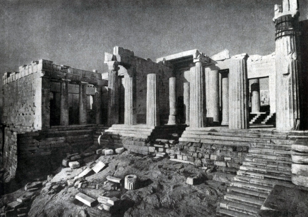 В праздник Больших Панафиней — день, когда от имени всего города-государства афинские девушки приносили в дар богине Афине вытканный ими пеплос, - шествие входило на Акрополь с запада. Дорога вела вверх, к торжественному входу на Акрополь — Пропилеям, построенным архитектором Мнесиклом в 437 - 432 гг. до н.э.. Обращенную к городу дорическую колоннаду Пропилеи обрамляли два неравных, но взаимно уравновешенных крыла здания. Одно из них - левое — было больше, но зато к меньшему примыкал выступ скалы Акрополя - Пиргос, увенчанный маленьким храмом Ники Аптерос, то есть Бескрылой Победы («бескрылой» - чтобы она никогда не улетала из Афин).