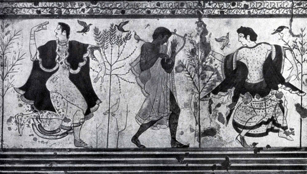 Сюжеты росписей сравнительно немногочисленны и часто повторяются. Обычно это сцены, где умерший изображен участником веселого, многолюдного пира, сопровождаемого танцами юношей и девушек. Изображения эти насыщены множеством характерных черт как в позах, жестах, мимике человеческих фигур, так и в тщательно переданных костюмах, узорчатых тканях, подушках, утвари и мебели. Пир и танцы происходили, повидимому, в саду под открытым небом, на что указывают деревья и птицы. Иногда встречаются портретные изображения умерших, сопровождаемые надписью. Распространены изображения гладиаторских боев, состязаний атлетов, торжественных погребальных шествий, в единичных случаях встречаются сцены охоты и пейзажи. В некоторых гробницах преобладают мифологические сюжеты, как в гробнице Орка в Корнето, где фигурируют боги подземного царства - Гадес и Персефона - и трехликий великан Герион, а также крылатые гении этрусского пантеона. Судя по мифологическим сюжетам, этрусская религия и мифология имели мрачный характер, были лишены светлой гармонии миропонимания греков. Живопись этрусков связана с греческой и проходит в своем развитии этапы, сходные с этапами эволюции греческой вазописи. Росписи этрусских гробниц 6 - 5 вв. при обычной для них плоскостности изображения, силуэтном характере фигур и других чертах условности все же обладают своеобразной жизненной убедительностью, пониманием выразительного движения, чувством композиционной связи. Обнаженные или одетые в красочные костюмы человеческие фигуры даны в теплых звучных тонах - желтых, коричневых, красных, обогащенных пятнами зеленого и голубого; будучи контрастно сопоставлены друг с другом и объединены в общую композицию, они производят сильный декоративный эффект. Роспись применялась также и в наружном убранстве зданий. Неотъемлемой частью декораций этрусских зданий были терракотовые расписные рельефы и статуи, столь распространенные в период архаики по всему античному миру. Кровли зданий украшались акротериями(Акротерий (от греческого-вершина, фронтон) - скульптура или скульптурно исполненный орнаментальный мотив над углами фронтонов зданий, построенных в античных ордерах.),с рельефными изображениями отдельных фигур или групп, и антефиксами (Антефиксы - украшения из мрамора или терракоты, обычно помещавшиеся по краям кровли вдоль продольных сторон античных храмов и домов.Антефиксы имели разнообразную форму (листа, растения, плиты, щита и т. п.) и обычно украшались исполненными в рельефе орнаментами, головами людей или фантастических существ.), на которых часто изображали голову Медузы Горгоны, отвращающей зло от живущих в доме, голову силена или девушки. Эти изображения были ярко раскрашены. Фризы снаружи и внутри здании также покрывались терракотовыми раскрашенными рельефными плитами с изображениями мифологических сцен,эпизодов состязаний и битв. Сравнительно небольшие постройки этого периода, богато украшенные расписными терракотовыми рельефами и скульптурой, производили нарядное, живописное впечатление.