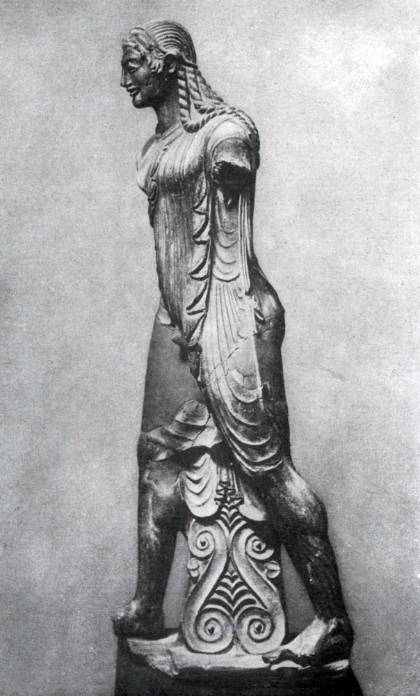 Важное место в этрусском искусстве занимала скульптура, расцвет которой относится к 6 в. до н.э. Наиболее известным этрусским скульптором был работавший в Беях мастер Вулка; ему принадлежит монументальная терракотовая статуя Аполлона из Вей. Статуя, повидимому, была частью помещенной над фронтоном храма скульптурной группы, изображавшей спор Аполлона с Гераклом из-за лани. При несомненной близости к греческим статуям эпохи архаики (условностью постановки фигуры и пластической моделировки, архаической улыбкой) Аполлону из Вей присущи и черты своеобразия - меньшая скованность, более энергичное, хотя и условное движение, более яркая эмоциональная окраска образа; сильнее, нежели в греческой скульптуре, в этрусской статуе выражена тяга к отвлеченной орнаментальности (например, в трактовке одежды). Прекрасным образцом этрусской скульптуры времени ее расцвета является изящная голова статуи Гермеса из Вей. Одной из важных находок недавнего времени были колоссальные этрусские статуи воинов, сделанные из глины; их мрачный, устрашающий облик проникнут грубой мощью.