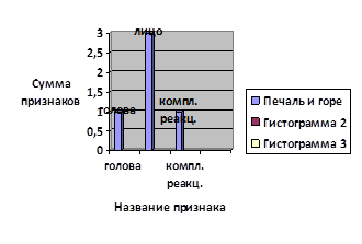 Анализ Если мы посмотрим на профили эмоций, то заметим, что самым информативным признаком в каждом случае является лицо. Эмоция боль - самый информативный признак лицо, наименее информативные - голова и руки. Эмоция удивление - самый информативный признак лицо, наименее информативный – голова. Эмоция внимание произвольное – наиболее информативный признак – лицо, наименее – голова, корпус и руки. Эмоция радость – самый информативный признак лицо, наименее – руки. Эмоция презрение – самый информативный признак лицо, наименее – корпус. Эмоция печаль и горе – наиболее информативный признак лицо, наименее голова и корпус. Эмоция удивление – наиболее информативный признак лицо, наименее – голова и комплексные реакции. Если мы сравним между собой профили полярных эмоций, то получится, что они существенно отличаются друг от друга. Например, радость – печаль. Радость содержит больше информативных признаков, чем печаль, а так же самый информативный признак – лицо, более выразителен в эмоции радость. Если сравнивать удивление – презрение, то тут самый информативный признак – лицо, более выражен в презрении, хотя количество информативных признаков одинаково. Анализируя гистограммы эмоций, мы можем сказать, что суммарная интенсивность и частота проявлений также самая высокая у опорного признака лицо (3) во всех эмоциях. Все остальные признаки имеют одинаковую частоту проявления и суммарную интенсивность (1): голова, руки, комплексные реакции, корпус.