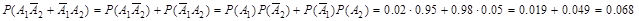 Теорема сложения вероятностей несовместных событий. Вероятность появления одного из двух несовместных событий равна P(A+B)=P(A)+P(B). Следствие. Вероятность появления одного из нескольких попарно несовместных событий равна сумме вероятностей этих событий: P(A1+A2+..An)=P(A1)+P(A2)+...+P(An). Теорема сложения вероятностей совместных событий. Вероятность появления одного из двух совместных событий равна P(A+B)=P(A)+P(B)-P(AB). Следствие. Для зависимых событий: P(A+B)=P(A)+P(B)-P(A)P(B|A) Для независимых событий: P(A+B)=P(A)+P(B)-P(A)P(B) Пример 4. Вероятности поражения цели первым и вторым орудиями равны 0.9 и 0.8. Найти вероятность поражения цели при залпе. A1={первое орудие поразило цель}, A2={второе орудие поразило цель}. P(A1+A2)=P(A1)+ P(A2)-P(A1A2)= P(A1)+ P(A2)-P(A1)P(A2)=0.9+0.8-0.72=0.98 Пример 5. Условие примера 3. Найти вероятность того, что только одно изделие бракованное. A1={первое изделие бракованное}, A2={второе изделие бракованное}.
