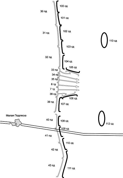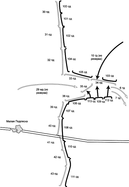 «Вы все еще считаете танки?» Немецкая 15‑см гаубица sFH‑18 на огневой позиции, зима 1941–1942 гг. Расчет орудия еще не закрыт броней и при поспешном занятии позиции он был очень уязвим к ответному огню. Таким образом, сразу потребовалась коррекция планов контрудара в связи с реалиями обстановки. Должен сказать, что впечатление театра абсурда от Приграничного сражения, создающееся в результате чтения мемуаров, обманчиво. Авторы мемуаров чаще всего не обладали всей полнотой информации о действиях соседей и потому не понимали логики происходящего. Например, в описаниях действий 8‑го механизированного корпуса присутствует эпизод встречного прохождения через Львов частей 8‑го мехкорпуса и 8‑й танковой дивизии 4‑го мехкорпуса. Первые двигались с запада на восток, вторая – с востока на запад. На первый взгляд – «хаос и потеря управления!». Однако причины этого прохождения на самом деле просты и очевидны – 8‑й мехкорпус у Музыченко уже отобрали, а 8‑я танковая дивизия П.С. Фотченкова направлялась на соединение с другими дивизиями своего корпуса с целью подпирания фронта 6‑й армии. Пока танкисты корпуса Д.И. Рябышева мотались по дорогам и сражались в районе Броды – Дубно, корпус А.А. Власова бился с немецкой пехотой в Яновских лесах, метался вдоль рушащегося фронта 6‑й армии на подступах к Львову. Потеря времени на определение наряда сил, которые можно выделить для контрудара, привела к запаздыванию контрнаступления и изменению обстановки. Немцы успели продвинуться довольно глубоко, и, соответственно, потребовался сдвиг направлений ударов мехкорпусов на восток. Поначалу глубокое продвижение противника даже вызвало легкую панику, и командование фронта под угрозой удара в тыл войскам в львовском выступе вывело из боя и заставило сделать изрядный 105‑км крюк 15‑й механизированный корпус. Тревога оказалась ложной, поворота немецкого танкового клина не произошло, но на исходные позиции корпус И.И. Карпезо вернулся только вечером 25 июня. Вечером 24 июня советское командование снова сделало попытку собрать все имеющиеся в его распоряжении механизированные соединения для контрудара по флангам танковой группы. В 21.00 штабом Юго‑Западного фронта издается боевой приказ № 0015 на нанесение контрудара силами 8, 15 и 4‑го механизированных корпусов. Целью танковых соединений снова было срезание вбитого в оборону фронта танкового клина. Глубина удара составляла едва ли не 60 километров. Однако утром 25 июня назначенные для контрудара соединения были еще на марше. Ввести в бой основные силы выдвинутых из глубины 9‑го и 19‑го и подчиненных штабу фронта 8‑го и 15‑го механизированных корпусов удалось только 25–26 июня. День 25 июня характеризовался действиями передовых отрядов, занимавших исходные рубежи для спланированных контрударов. В частности, 34‑я танковая дивизия 8‑го механизированного корпуса получила задачу прикрыть развертывание корпуса в исходном положении для контрудара. В 16.00 25 июня дивизия получила приказ сосредоточиться в районе северо‑восточнее Брод и захватить переправы на реке Сытенка на фронте 16 км, от Ситное до Полноче. К вечеру дивизия вышла в указанный район и взяла под контроль переправы. Важнейшую переправу на дороге из Радвиллова у Крупец удерживал разведывательный батальон дивизии. Остальные переправы на Сытенке контро